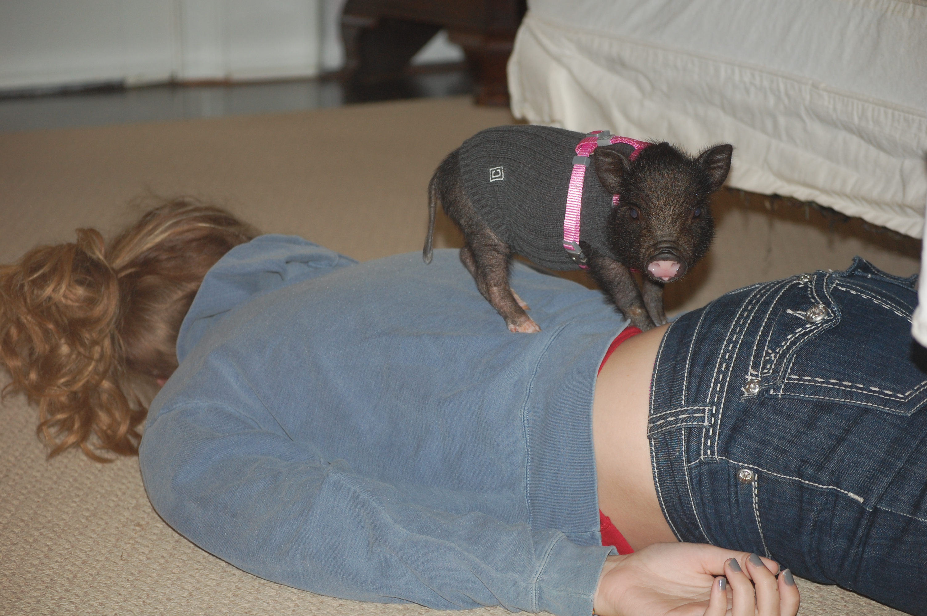 That pig is smart. She flirted and shamelessly threw herself at him all night, rolling over to expose a giant swollen underbelly so fecund and obscene that I felt embarrassed and looked away. When he sat in a chair, she tried to climb up into his lap.