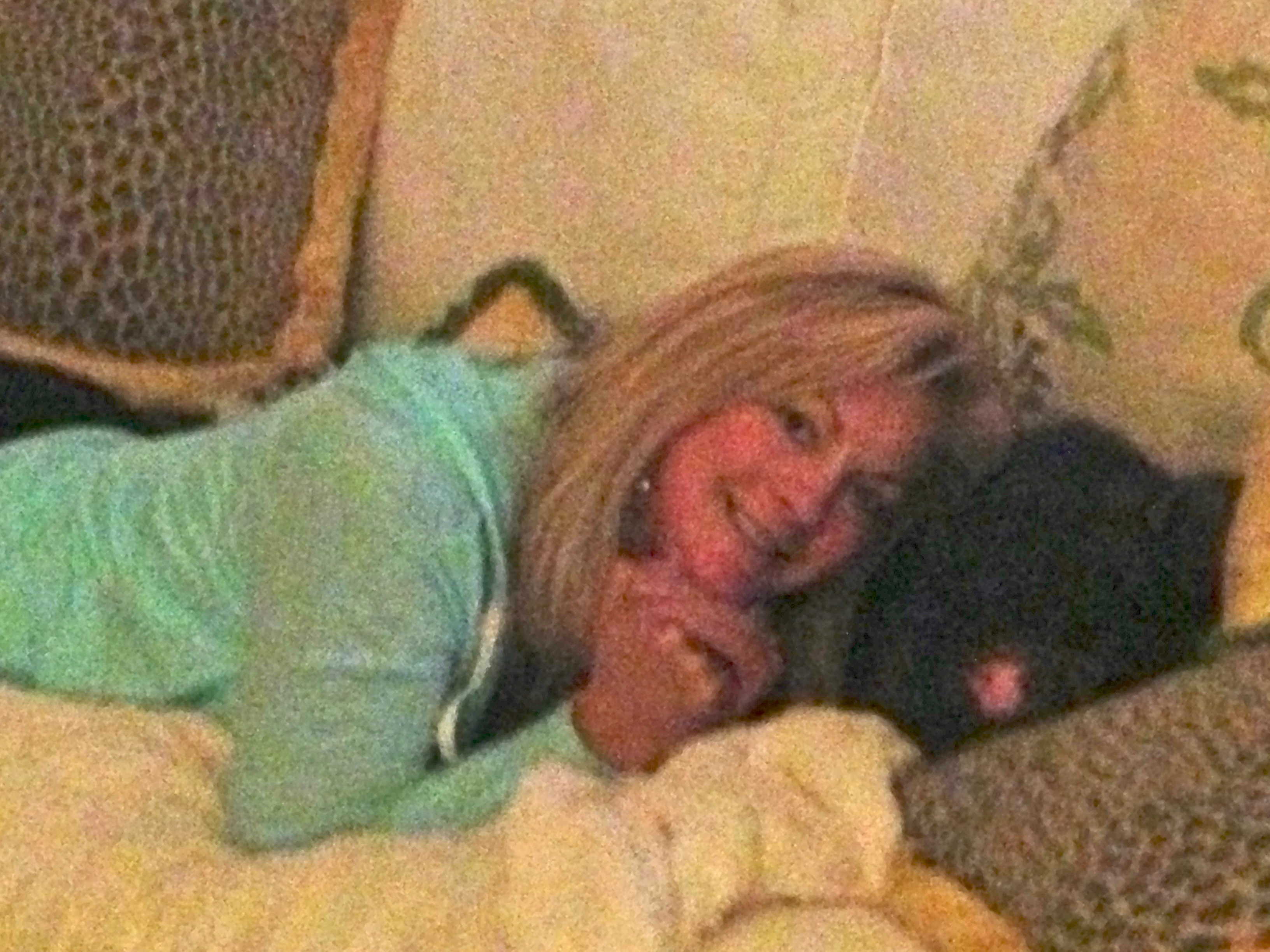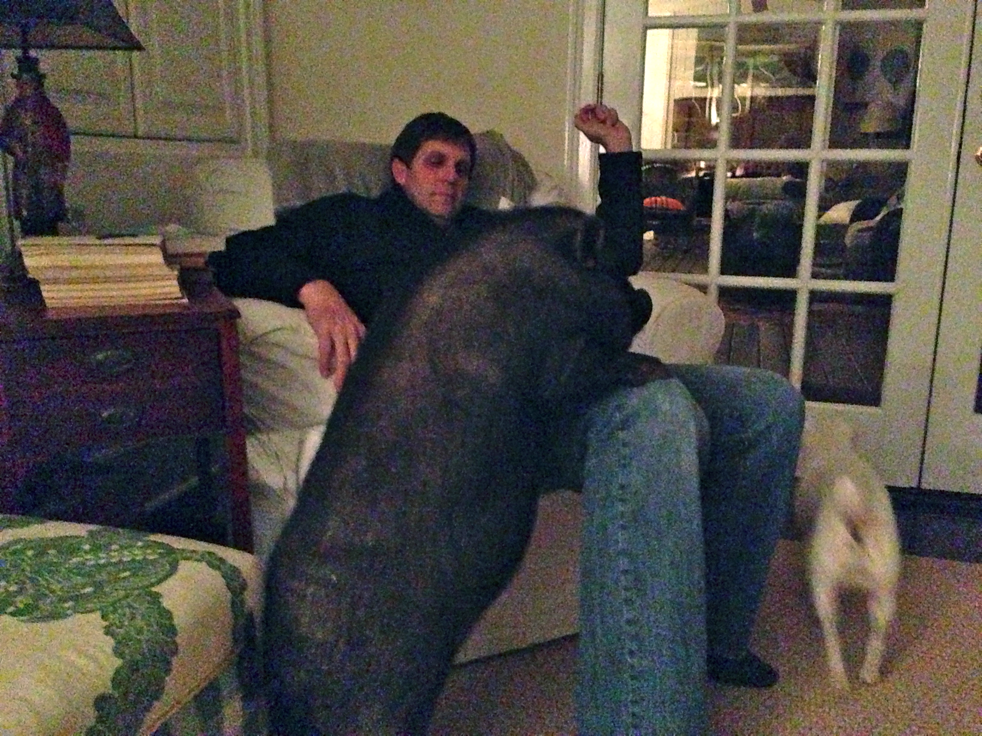 When he left the room, she launched herself up on the sofa with me and tried to look interested in what I was watching. She pretended to bite my foot and then pulled back and chuckled to make herself seem funny and endearing. She struck several fetching poses accompanied with sighs so mournful one would think someone has uttered “bacon”. She politely moved away from the dogs‘ bowls when I asked her to, and when I said “bedtime”, she marched purposely towards her crate, pausing only to root me lovingly.
